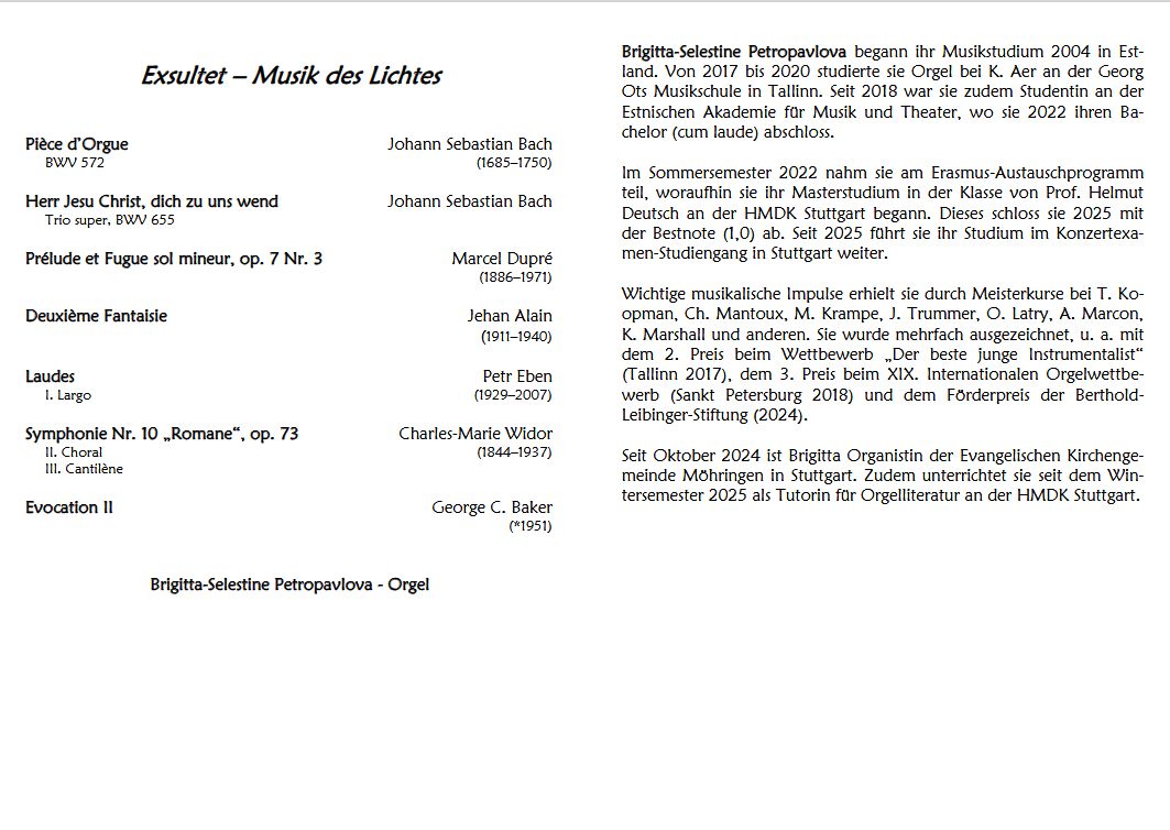 ♦ Karfreitag, 03. April 2026, 17.00 Uhr: Johannes Brahms: Ein Deutsches Requiem (Orgelfassung) Solostimmen: NN – Alexandra Mircea-Constantin und Rainer Oster (Orgel) – Oratorienchor Saarbrücken – Annemarie Ruttloff (Leitung)