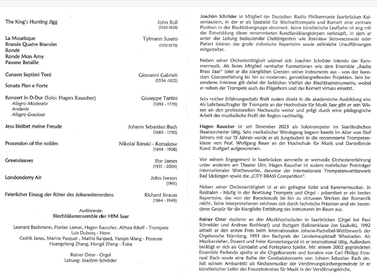 Ausführende: Es musizieren zwölf Blechbläser der HfM Saar und Rainer Oster (Orgel)
